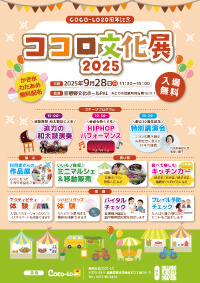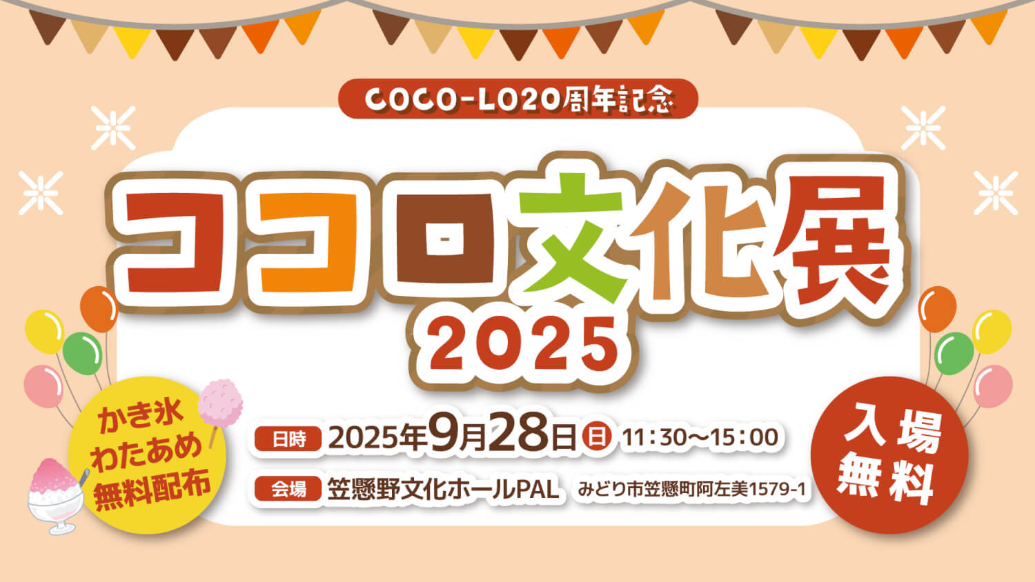 皆さまに支えていただき、有限会社COCO-LOは創立20周年を迎えることができました。その節目を記念して、感謝の気持ちを込めたイベント 「ココロ文化展 2025」 を開催いたします。入場無料で、どなたでもお気軽にご参加いただけます。ぜひご家族やご友人と一緒にお越しください。