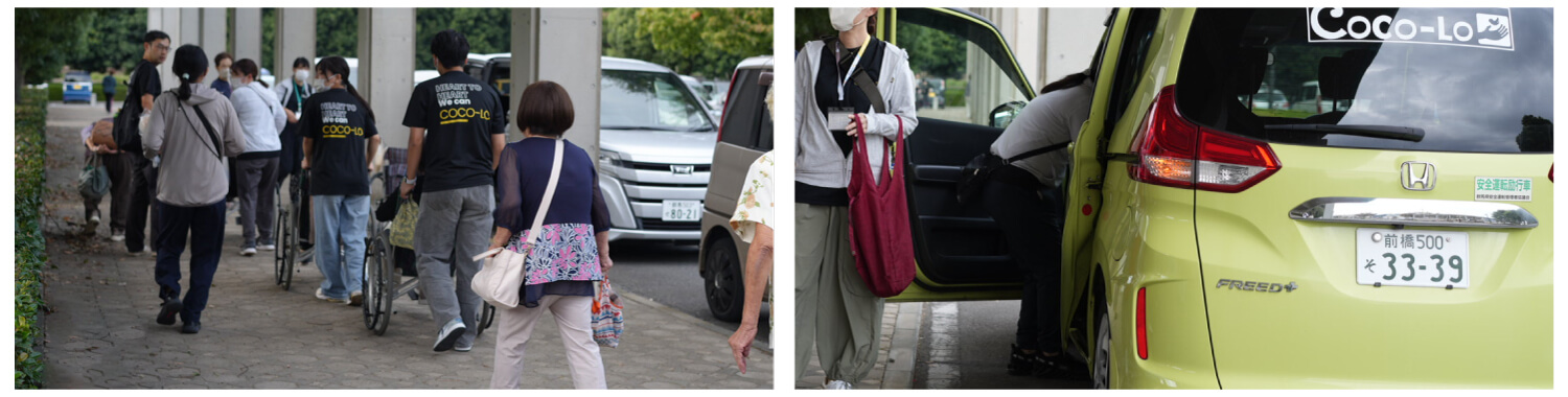 送迎です。今回はココロ号16台での送迎でしたので、どのルートで回れば利用者さんが長時間車に乗らなくてすむか、何度も話し合いました。当日も歩行が難しい方にはスタッフが寄り添い、安全に楽しんでいただけるよう気を配りました。