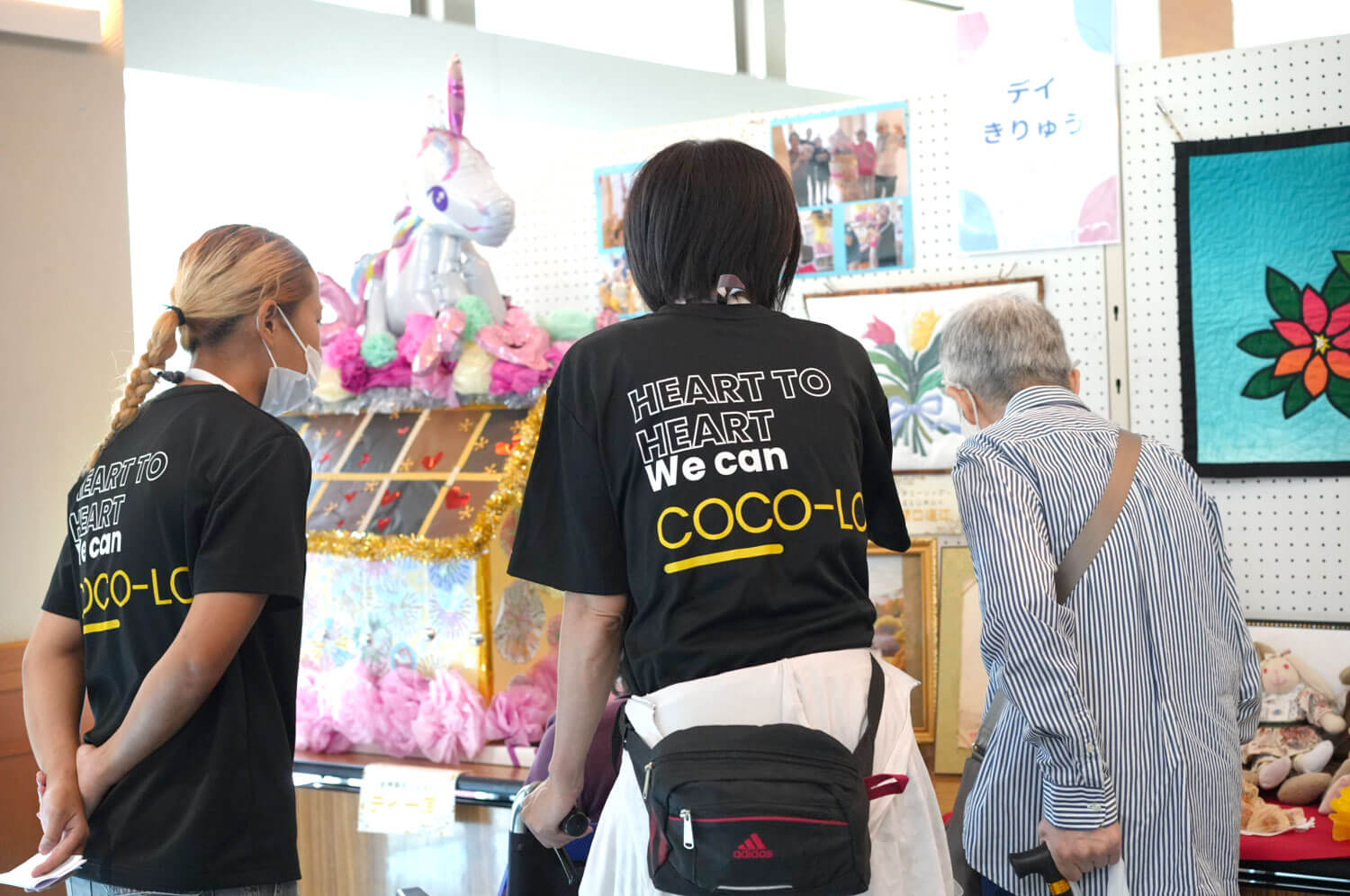 各事業所に10点ずつお願いし、大きな共同作品と利用者さんの手作り作品を並べました。ココロデイサービスは段ボールで作ったお神輿、アットホームは桜の貼り絵。縫い物や編み物もあり、一つひとつに気持ちがこもっていました。スタッフや利用者さんの顔をAIで描いた未来的な作品もあり、「えー、こんな時代になったの?」と驚く声が多く聞かれました。